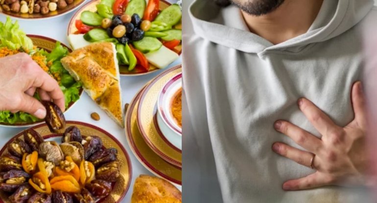 1. Xüsusilə iftarda (oruc açarkən) mədənin həddindən artıq yüklənməsi qan təzyiqini artırır, ürək döyüntüsünə səbəb olur və infarkt riskini artırır! Yavaş yeyin və mədənizi yormayın.