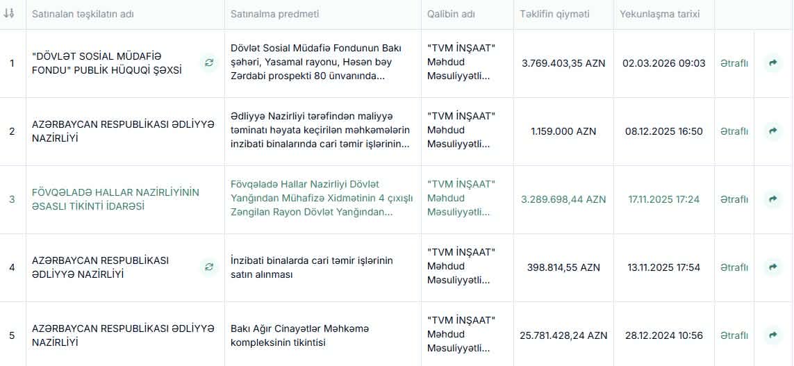 “TVM İnşaat” MMC ötən il 3 tenderin qalibi seçilib. Ədliyyə və Fövqəladə Hallar nazirlikləri tərəfindən keçirilən tenderlər üzrə satınalma müqavilələrinin ümumi maliyyə dəyəri 4 847 512,99 manatdır.