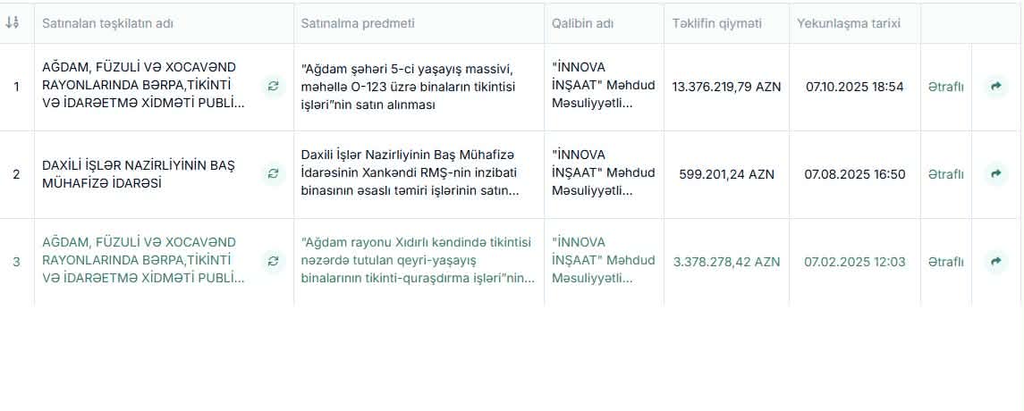 “İnnova İnşaat” Məhdud Məsuliyyətli Cəmiyyəti isə 2019-cu ildə təsis edilib. Şirkətin qanuni təmsilçisi Həsənli Elmar Azər oğludur. Hüquqi ünvanı: AZ3000, İMİŞLİ RAYONU, QARALAR Etender.gov.az saytınında yerləşdirilən məlumata əsasən şirkət 2025-ci ildə 3 müsabiqə üzrə tenderin qalibi olub. Bu tenderlərin ümumi dəyəri 17 milyon 355 min manat təşkil edib. Ən bahalı müsabiqə 13,4 milyon manat dəyəri olan “Ağdam şəhəri 5-ci yaşayış massivi, məhəllə O-123 üzrə binaların tikintisi işləri”nin satın alınması müsabiqəsidir.